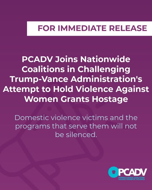 The group of state domestic violence and sexual assault coalitions joining PCADV in the lawsuit includes Rhode Island Coalition Against Domestic Violence; California Partnership to End Domestic Violence; Colorado Coalition Against Sexual Assault; DC Coalition Against Domestic Violence; End Domestic Abuse Wisconsin: The Wisconsin Coalition Against Domestic Violence; Idaho Coalition Against Sexual and Domestic Violence; Iowa Coalition Against Domestic Violence; Jane Doe Inc. (The Massachusetts Coalition Against Sexual Assault and Domestic Violence); Kansas Coalition Against Sexual and Domestic Violence; North Carolina Coalition Against Domestic Violence; Montana Coalition Against Domestic and Sexual Violence; Oregon Coalition Against Domestic and Sexual Violence; ValorUS; Violence Free Minnesota; Virginia Sexual and Domestic Violence Action Alliance; and Wisconsin Coalition Against Sexual Assault.